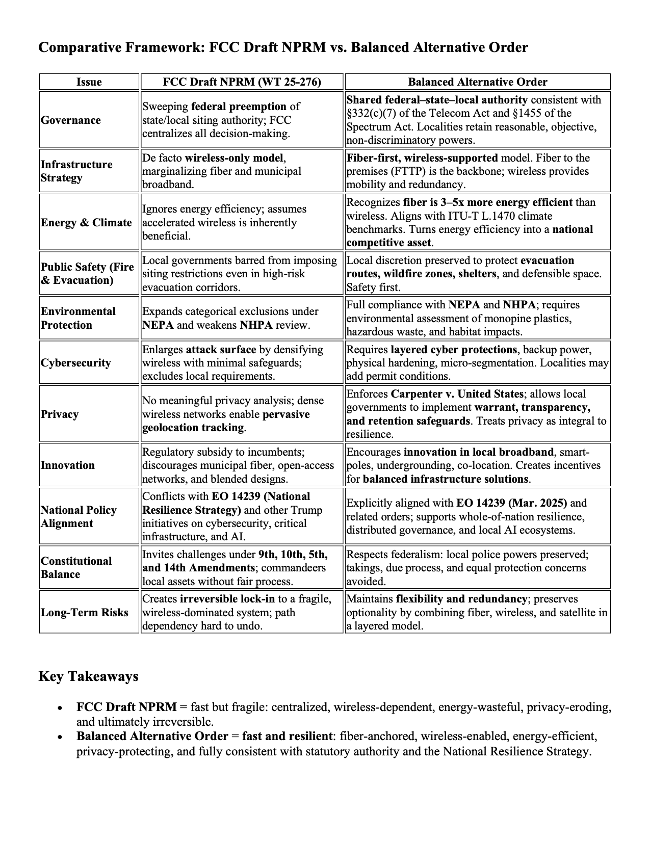 The attached Balanced Alternative FCC Order (WT Docket No. 25-276) outlines a practical, bipartisan path to accelerate broadband deployment without compromising national resilience, privacy, or local innovation. It embodies the intent of the National Resilience Strategy (Executive Order 14239, March 2025)—ensuring that America moves fast, but wisely.